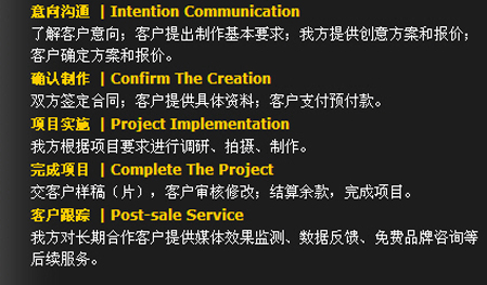 意向溝通 | Intention Communication 十年磨一劍,經(jīng)典影視已經(jīng)成為業(yè)內規(guī)?;放苽鞑I(yè)機構。   思想力——Idea Create Value! 品牌傳播相信:只有與眾不同的創(chuàng)意,才能為客戶創(chuàng)造價值!出色的藝術是創(chuàng)意品牌的保證;我們是客戶的伙伴,我們并肩作戰(zhàn),只為創(chuàng)造一個偉大的品牌。   智慧力——創(chuàng)作團隊 創(chuàng)意總監(jiān)——創(chuàng)意來自生活,高于生活 美術指導——身手敏捷,思想敏銳,具有獨特的美術嗅覺 資深策劃——思維縝密而又膽識過人,常常給人意外之喜 經(jīng)典影視.品牌傳播,采用國際化的Team作業(yè)模式——   保證力——作業(yè)流程 我們一直相信,只有科學、規(guī)范的作業(yè)流程作為運作保障,優(yōu)秀的創(chuàng)意才能得以完美的實施。在經(jīng)典影視,我們一直秉承——策略精準 . 創(chuàng)意新銳 . 執(zhí)行出色。
